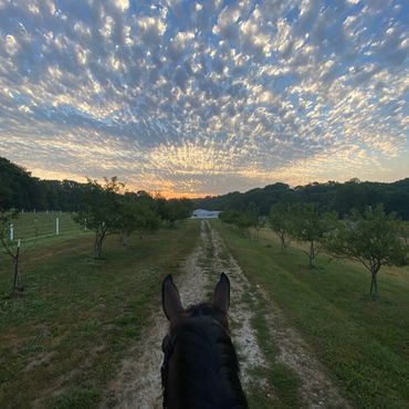 Take in the amazing sunset views as you wander around the property, past the beautiful lake, all on the gravel trails. Take a stroll through the orchard and grab an apple for you and your horse.